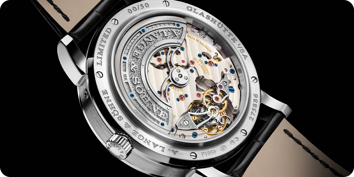 The watch remains visually consistent with the Lange 1 family. The asymmetrical layout stays intact, and the case dimensions only expand slightly to accommodate the new calibre. What changes is how much of the watch is exposed to the wearer at any given moment.