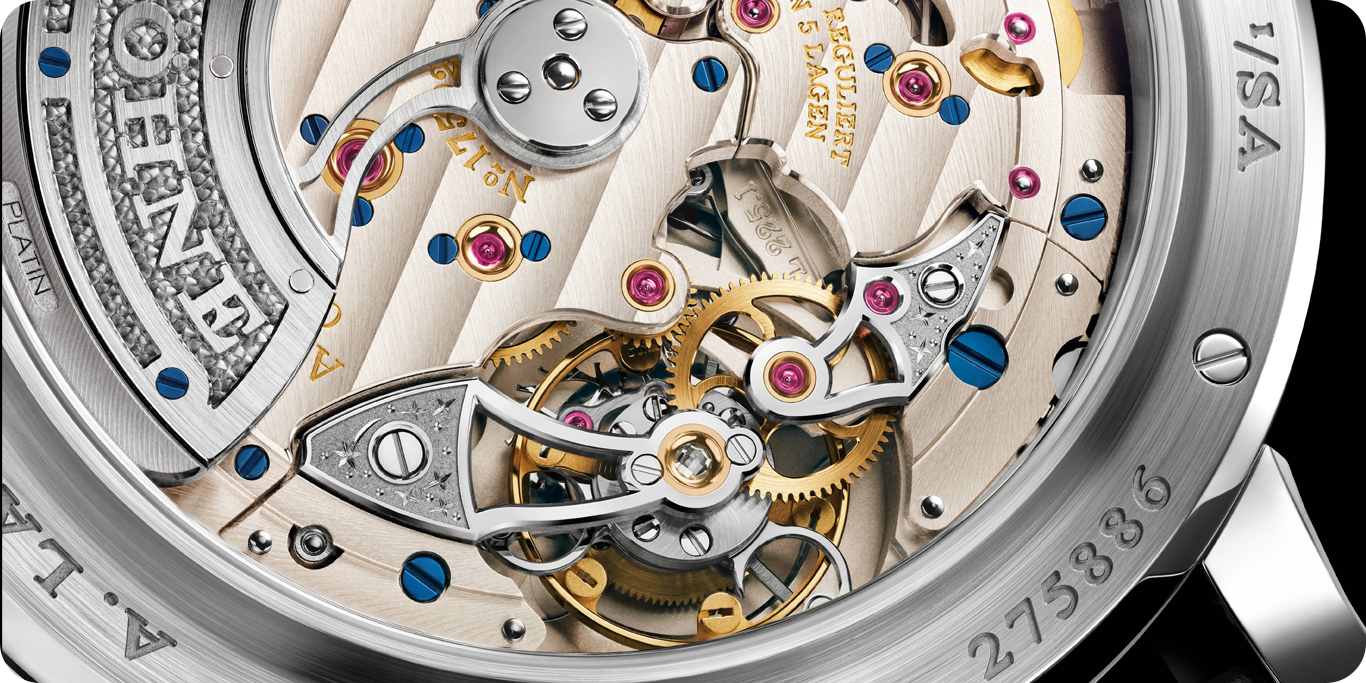 The new calibre L207.1 replaces the earlier Sax-O-Mat movement, trading the zero-reset seconds mechanism for a central rotor and extending the power reserve to 60 hours. The movement is built to Lange’s usual standard, with German silver bridges, gold chatons, and a hand-engraved balance cock visible through the caseback.