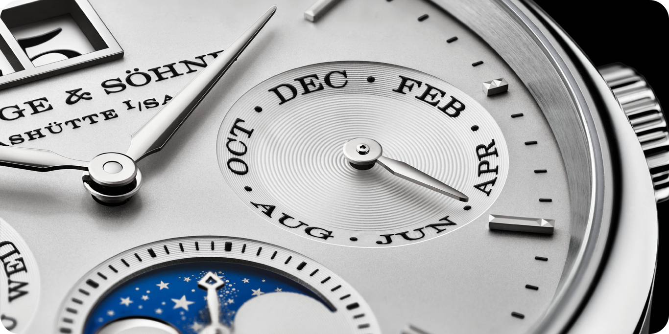 The calendar architecture follows the same logic as previous Lange perpetuals but with additional mechanical complexity. The peripheral month ring advances instantaneously, driven by an accumulator system that stores energy over the course of the day and releases it in a single impulse. The moonphase integrates a day and night indication beneath a figure-eight display, maintaining accuracy for more than a century before requiring correction.