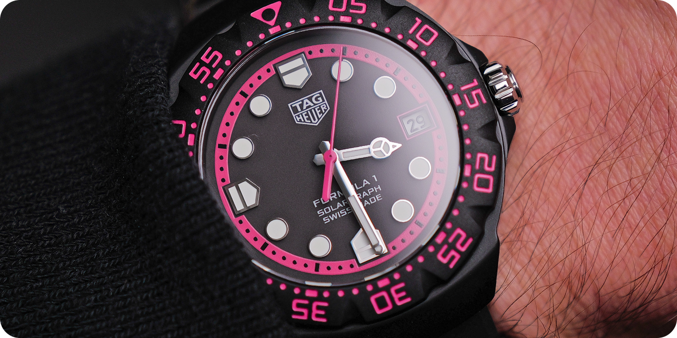 AG: I tend to wear one watch for a couple of months straight. At the moment, it's a TAG Heuer Formula 1, the pink and black DLC Abu Dhabi GP limited edition released last December. I'd never owned a TAG before, but I saw it and just went, yeah, I like that. When it comes to watches, pink is my honey trap. If I see it, I'm probably going to obsess over it.
