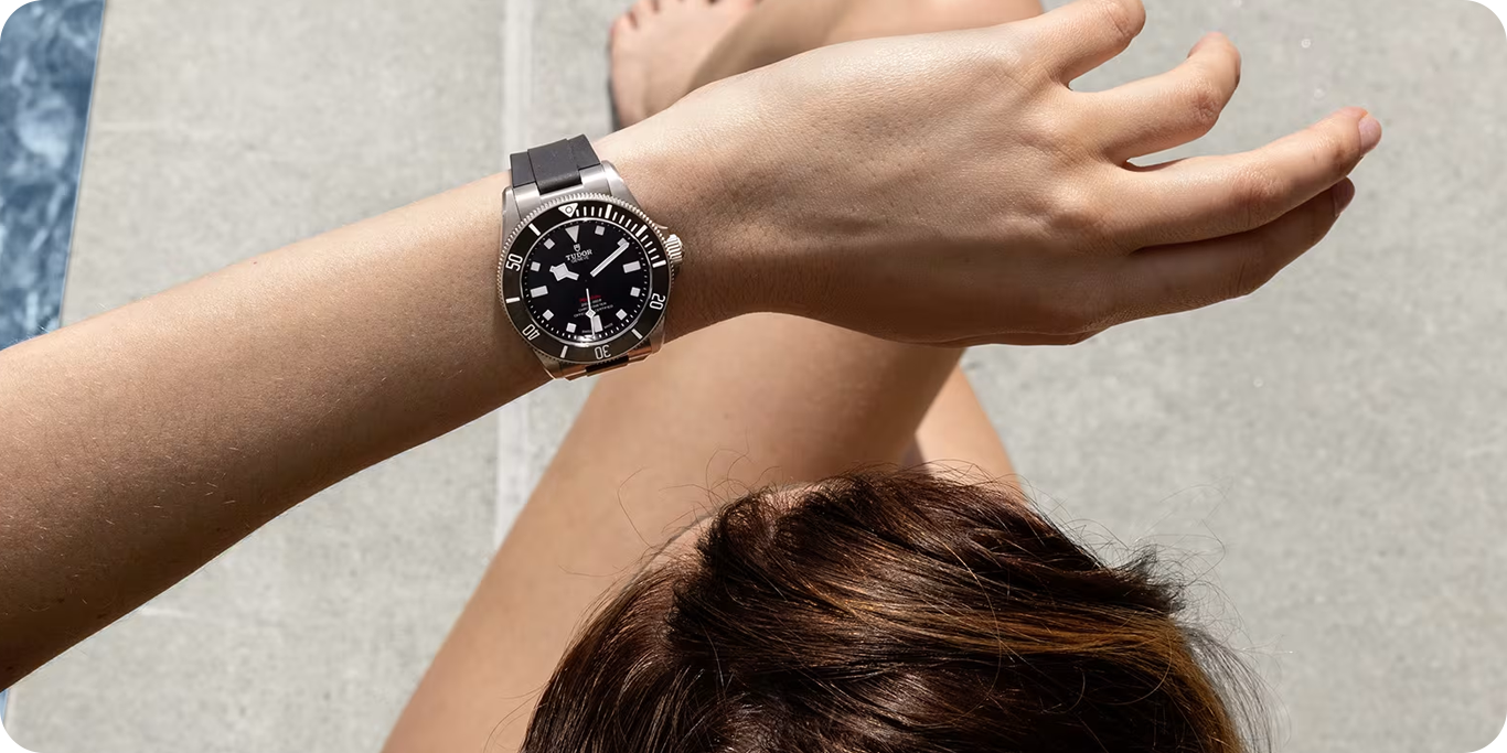 Tudor Pelagos watches feature a patented fold-over clap on their three-piece titanium bracelet, The clasp will lengthen and shorten depending on the environmental pressure. The timepiece also has diving extensions that make it possible to adjust the bracelet for a perfect fit.