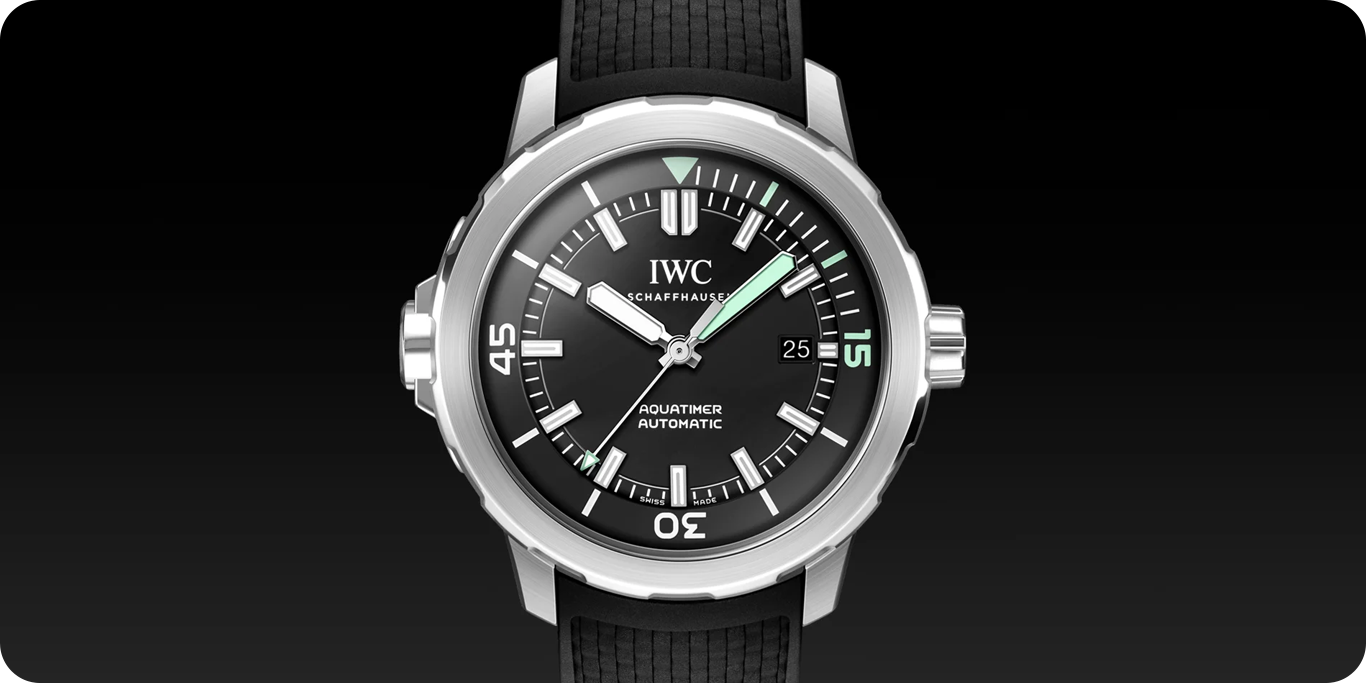 The Aquatimer is based on IWC’s innovative approach to dive watch functionality. A defining feature is the IWC-patented SafeDive system, which integrates an internal and external rotating bezel for precise dive time tracking. The internal bezel, operated via an external crown or ring, ensures added safety by preventing accidental adjustments.