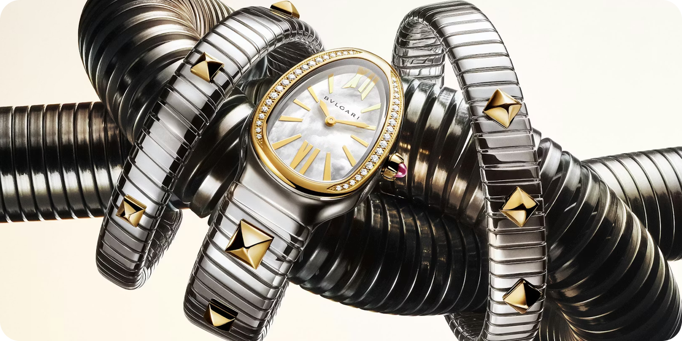 Here, the addition comes from within Bvlgari’s own archive. Small pyramidal studs, originally developed in the late 1970s, are set into the steel-and-gold coil, introducing a different kind of surface tension into something that’s usually defined by smoothness.
