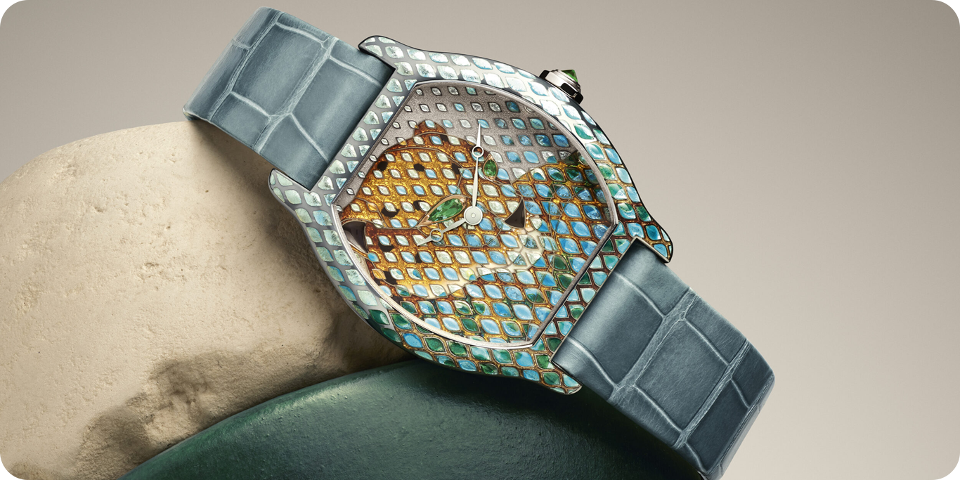 The everyday models are straightforward, offered in multiple metals and sizes with optional diamond settings, but they primarily serve as context for the métiers d’art piece. The Panthère Tortue is the one that defines this release. A scene of a panther in the rain is rendered in champlevé enamel, a technique that involves carving channels into metal and filling them with enamel before firing. Here, the work extends beyond the dial and into the case itself, creating a continuous surface.