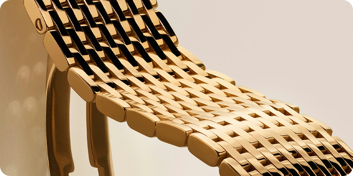 The new bracelet draws directly from Cartier’s own 1920s metal straps, built as a series of small, closely spaced links that drape more like fabric than a conventional bracelet. That difference is immediately noticeable. It shifts how the watch wears without altering how it reads. The obsidian-dial version leans further into that idea, pairing a stone dial cut to a fraction of a millimeter with a full gold bracelet, pushing the watch slightly closer to jewelry without abandoning its original identity.