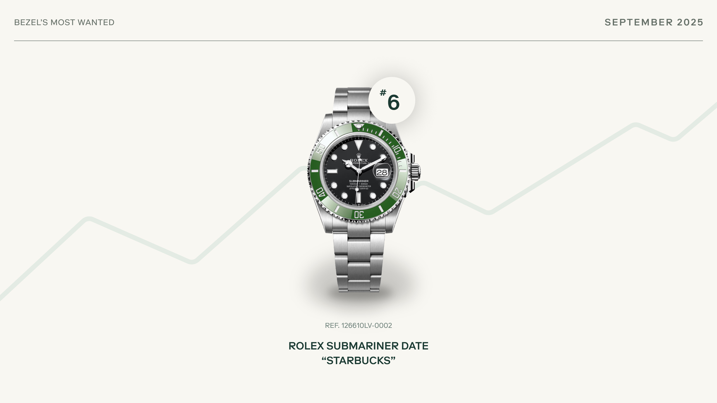 Down slightly from August’s sixth place but still strong, the “Starbucks” held steady as a modern compromise between the Hulk’s flash and the black bezel-fitted variant’s restraint. Its balance of color and versatility continues to appeal across the board.