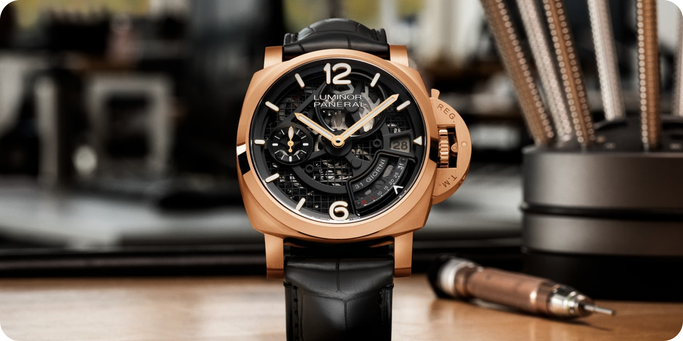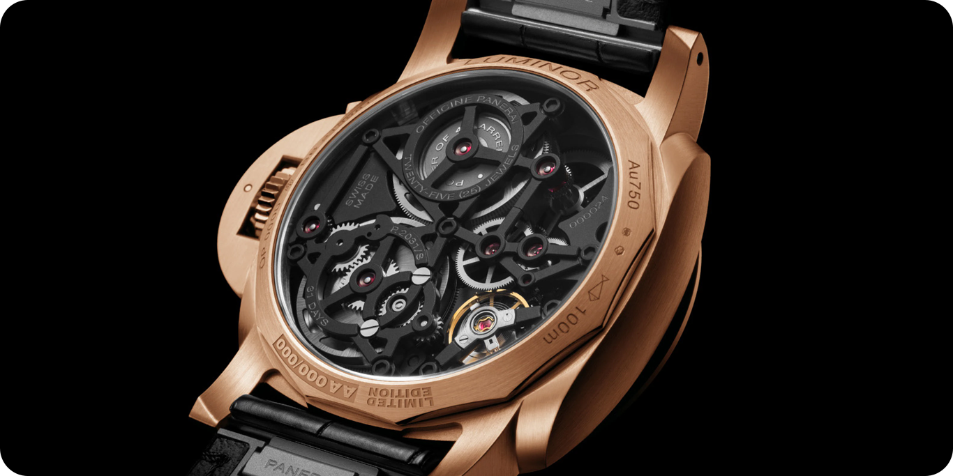 The case, in Goldtech, keeps the proportions consistent with the broader Luminor line. At 44mm, it doesn’t expand outward to match the scale of the movement, which keeps the watch aligned with the rest of the collection rather than separating it.